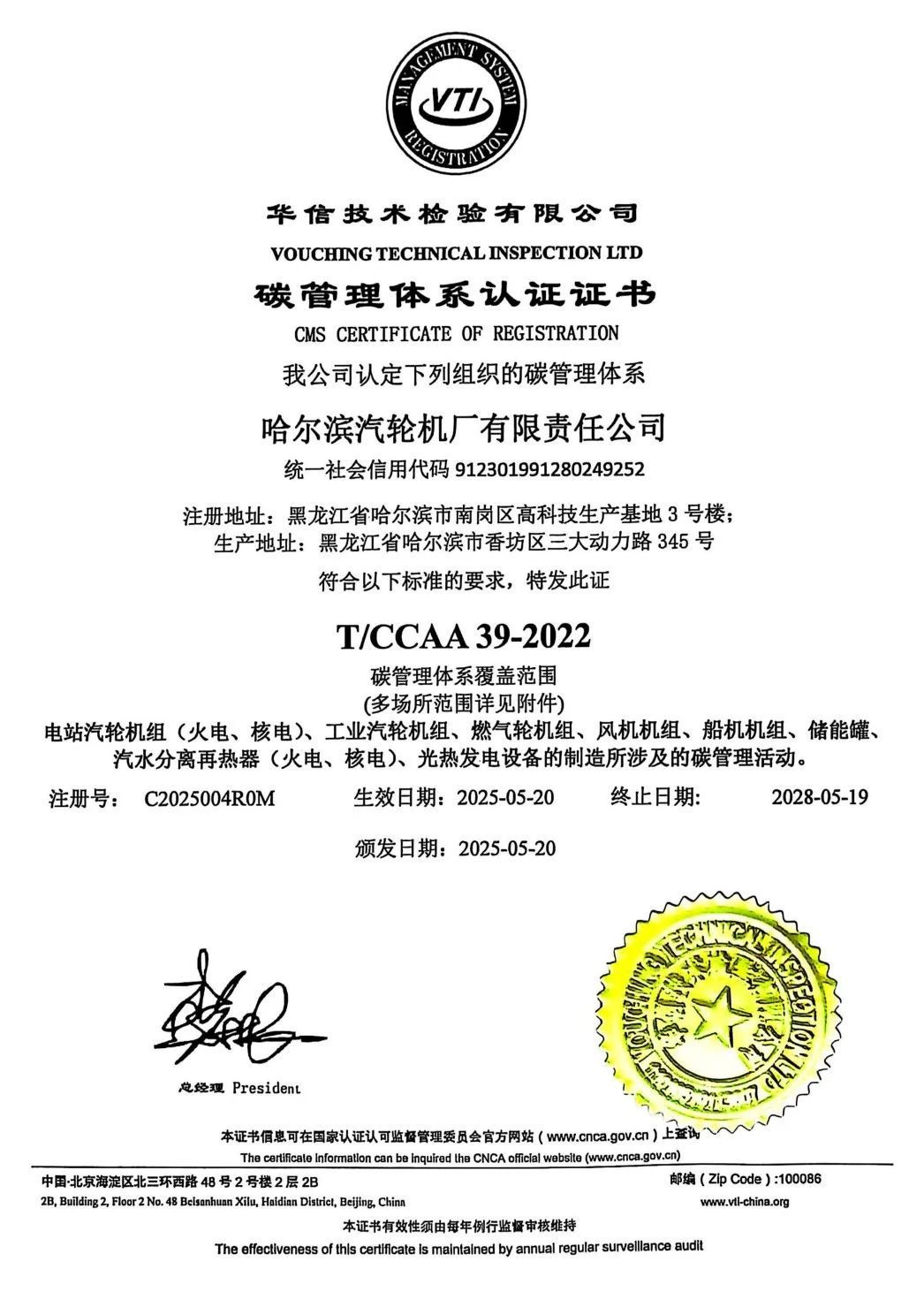 碳管理體系的建立與通過認(rèn)證,是哈電汽輪機(jī)碳管理能力水平提升的重要體現(xiàn),為公司未來能碳管理工作的高效開展和綠色發(fā)展戰(zhàn)略的順利實(shí)施提供了有力保障。展望未來,哈電汽輪機(jī)將以此次認(rèn)證為新起點(diǎn),繼續(xù)深耕綠色低碳領(lǐng)域,不斷探索創(chuàng)新,為推動(dòng)行業(yè)綠色轉(zhuǎn)型和實(shí)現(xiàn)國家“雙碳” 目標(biāo)持續(xù)貢獻(xiàn)力量。