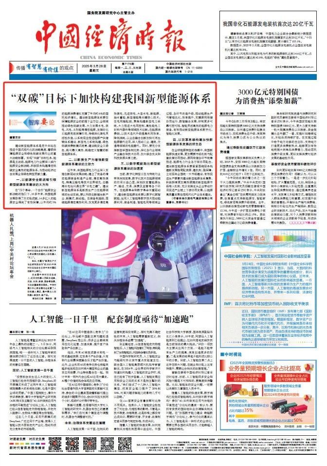 3月28日,國務(wù)院發(fā)展研究中心主管主辦的《中國經(jīng)濟(jì)時報》頭版頭條“智庫要論”專題刊發(fā)哈電集團(tuán)董事長、黨委書記曹志安《“雙碳”目標(biāo)下加快構(gòu)建我國新型能源體系》一文。