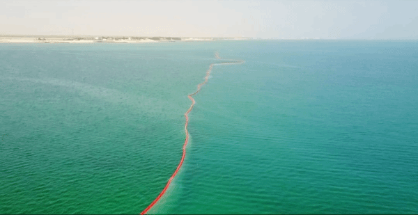 在水工結(jié)構(gòu)開工之前圍設(shè)防淤簾,其主要作用是形成一道防污屏障,用來阻隔和限制施工區(qū)域內(nèi)攪動(dòng)的泥沙及產(chǎn)生的污染物向施工區(qū)域以外擴(kuò)散,從而確保施工區(qū)域周圍的水體不受污染;同時(shí),防御簾還起到了阻攔海龜、海豚等海洋動(dòng)物誤入施工區(qū)域的作用。從環(huán)保的角度來講,這些伸展在海面上醒目的橙紅色“防污染警戒線”,傳達(dá)了中國(guó)企業(yè)綠色環(huán)保理念的生態(tài)保護(hù)線。