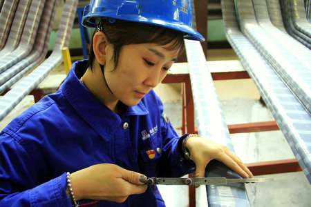 在電機(jī)公司線圈分廠有這樣一位人人稱頌的貼心好班長,她就是哈爾濱市五一巾幗標(biāo)兵、哈電集團(tuán)優(yōu)秀共產(chǎn)黨員、電機(jī)公司巾幗十佳標(biāo)兵,水電定子絕緣班班長徐鑫。身材單薄瘦弱的她,在工作中,卻總是不甘示弱,對(duì)待每一項(xiàng)工作都精益求精,掌握一手精湛的操作技能。在白鶴灘定子線棒生產(chǎn)技術(shù)準(zhǔn)備過程中,她積極踐行集團(tuán)公司“提質(zhì)增效黨員先行”黨建載體工程要求,以公司黨內(nèi)主題實(shí)踐活動(dòng)為載體,帶領(lǐng)班組黨員刻苦鉆研創(chuàng)新,設(shè)計(jì)制作了專用裝置,并在真機(jī)試驗(yàn)線棒生產(chǎn)中應(yīng)用,為白鶴灘定子線棒質(zhì)量提升,打造精品工程奠定了堅(jiān)實(shí)的基礎(chǔ)。對(duì)待班組同事,她更是賦予了超強(qiáng)的耐心,這也使得同事們之間關(guān)系和諧融洽,形成了“快樂工作、快樂生活”的良好工作氛圍。