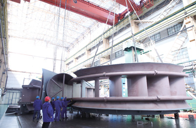 日前,哈電集團(tuán)哈爾濱電機(jī)廠有限責(zé)任公司車間里一派忙碌的生產(chǎn)場景,工人們?nèi)硇牡赝度氲桨Q灘、豐寧、兩河口等國家重大水電項目產(chǎn)品生產(chǎn)中。圖為該公司職工在生產(chǎn)世界單機(jī)容量最大白鶴灘水電機(jī)組1/2瓣座環(huán)組合。